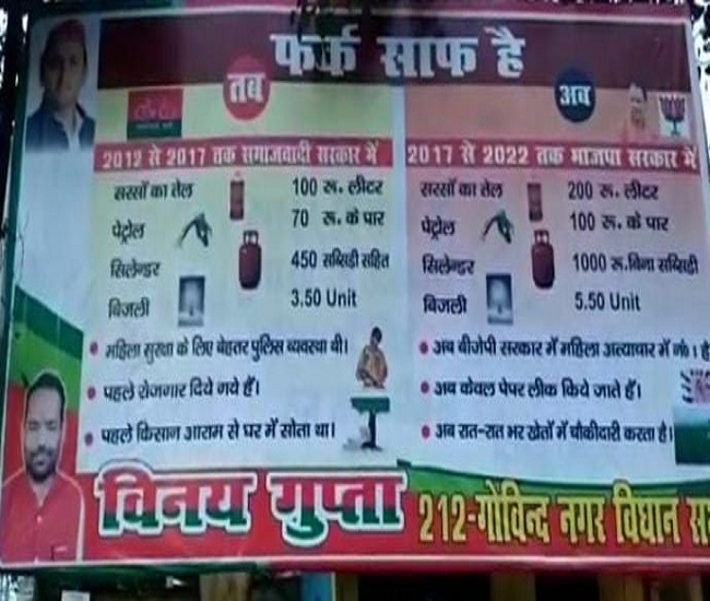 कानपुर (हि.स.)। उत्तर प्रदेश में विधान सभा चुनाव नजदीक आता देख भाजपा पूरी तरह से सपा को घेरने में जुट गई है। भाजपा ने फर्क साफ है का नारा दिया और जगह-जगह होर्डिंग्स लगवाकर सपा सरकार एवं भाजपा सरकार के कार्यों की तुलना की जाती है। ऐसे में सपा कार्यकर्ताओं ने उसी अंदाज में भाजपा को घेरने के लिए महंगाई को मुद्दा बनाकर फर्क साफ है की होर्डिंग्स शहर में लगवा दी, जिसकी चर्चा शहर भर में हो रही है।