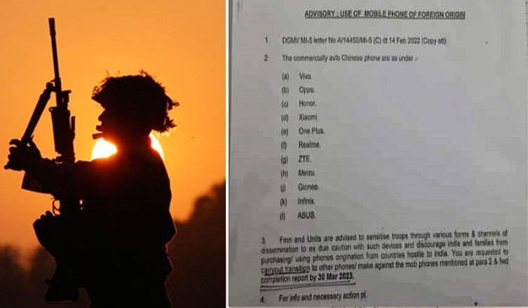 सेना मुख्यालय की ओर से जारी एडवाइजरी में सैनिकों और उनके परिवारों को दुश्मन देश की कंपनियों के मोबाइल फोन खरीदने या इस्तेमाल करने से बचने की सलाह दी है। इस सूची में चीनी कंपनी वीवो, ओप्पो, ऑनर, श्याओमी, वन प्लस, रियल मी, जेडटीई, मीजू, जियोनी, इनफिनिक्स और आसुस के मोबाइल फोन शामिल हैं। सलाह में यह भी कहा गया है कि जिन जवानों के पास उक्त कंपनियों के मोबाइल फोन हैं, वे 30 मार्च तक अवश्य बदल लें।