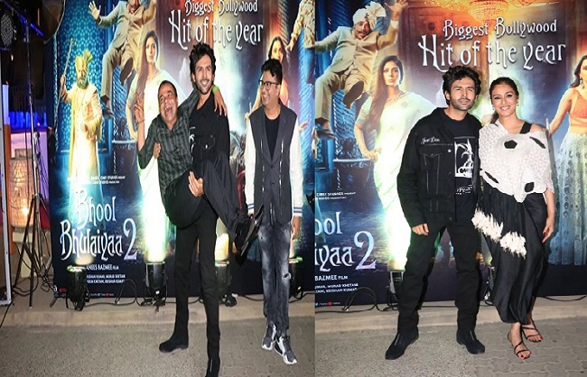 फिल्म की सफलता का जश्न मनाने के लिए एक सक्सेस पार्टी रखी ,जिसमें पूरी स्टारकास्ट ने शिरकत की। अब इस पार्टी की कई तस्वीरें सामने आ चुकी हैं।वहीं इस पार्टी में कार्तिक आर्यन और राजपाल यादव साथ में जमकर मस्ती करते नजर आये। इतना ही नहीं कार्तिक आर्यन ने पार्टी में राजपाल यादव को अपनी गोद में उठा लिया और जमकर पोज देते नजर आये। वहीं कार्तिक आर्यन ने तब्बू और भूषण कुमार के साथ-साथ फिल्म के सभी कलाकारों के साथ भी खूब तस्वीरें खिंचवाईं। सोशल मीडिया पर अब इस सक्सेस पार्टी की कई तस्वीरें वायरल हो रही हैं।