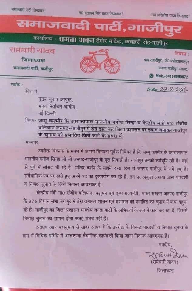 24 फरवरी को जम्मू कश्मीर के लेफ्टिनेंट गवर्नर मनोज सिन्हा का आगमन वाराणसी जनपद हुआ। 25 फरवरी को गाजीपुर जनपद के गहमर क्षेत्र में आकर करीमुद्दीनपुर रेवतीपुर व ऐतिहासिक कामाख्या मंदिर दर्शन पूजन कर वापस चले गए। उसके बाद रविवार को दोबारा उन्होंने मोहम्मदाबाद युसुफपुर में सोमेश्वर महादेव मंदिर में रुद्राभिषेक पूजन किया गया। मनोज सिन्हा द्वारा मंदिरों में किए जा रहे दर्शन पूजन पर समाजवादी पार्टी ने आपत्ति जताते हुए जिला निर्वाचन अधिकारी चुनाव आयोग को एक पत्र भेजकर उनके इस यात्रा पर आपत्ति जताते हुए कहा है कि श्री सिन्हा संवैधानिक पद पर हैं जो जनपद में प्रवास कर दर्शन-पूजन कर रहे हैं। जिससे वह पार्टी विशेष को राजनीतिक लाभ पहुंचाने का कार्य कर रहे हैं। एक तरफ जहां समाजवादी पार्टी ने अपने राजनीतिक कारणों से आपत्ति दर्ज कराई तो वहीं लोगों द्वारा इस आपत्ति को हास्यास्पद बताते हुए समाजवादी पार्टी से सवाल खड़ा किया गया कि क्या समाजवादी पार्टी को दर्शन-पूजन से भी परहेज हो गया है।