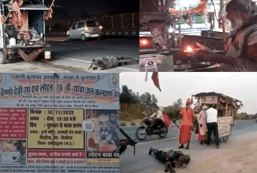 65 साल के श्रीश्री 108 गणेश गिरी महाराज उर्फ लोटन बाबा चमढ़ी रोड नाका के पास स्थित देवी मंदिर के महंत हैं। लोटन बाबा के साथ दो साधुओं के अलावा दो शिष्य भी चल रहे हैं। बाबा मुख्य हाईवे पर सफर करते हैं। इसलिए उनके आगे एक लोडर गाड़ी चलती है। उसके पीछे एक ढकेल पर बना देवी का मंदिर होता है। मंदिर में मां भगवती की छवि के साथ जोत जलती हुई रखी हुई है। बाबा सुबह शाम माता रानी की पूजा-अर्चना करते हैं और प्रसाद अर्पित करते हैं।