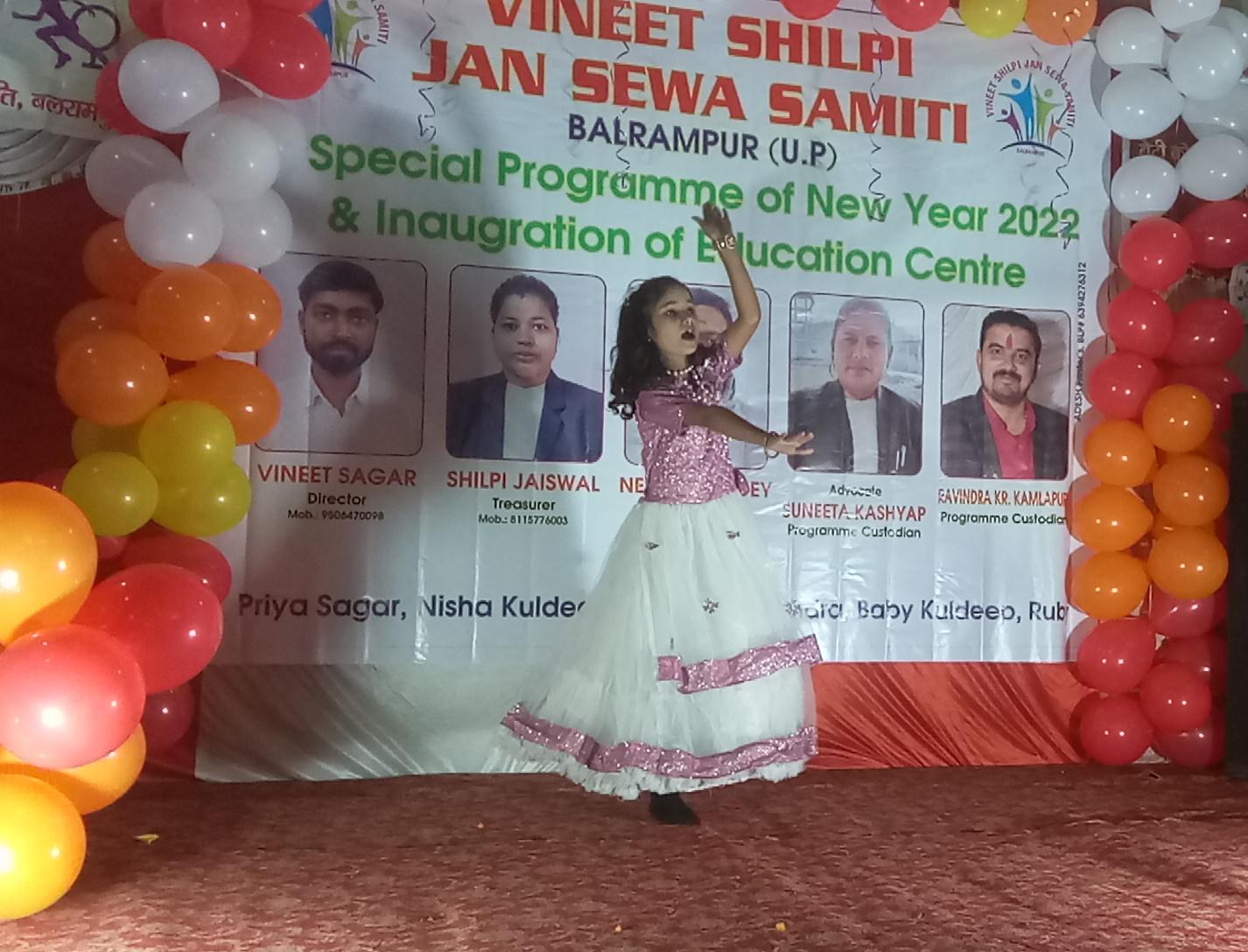 जनपद बलरामपुर नगर भगवती गंज विशनीपुर में नववर्ष के पावन अवसर पर विनीत शिल्पी जन सेवा समिति के प्रधान कार्यालय पर बच्चों का रंगारंग कार्यक्रम प्रस्तुत की गई इस अवसर पर मुख्य अतिथि शाबान अली चेयरपर्सन नगर पालिका परिषद् एवं विशिष्ट अतिथि संजय मिश्रा सभासद,विशिष्ट अतिथि मे कई सालों से समाज सेवा के रूप में काम करने वाले रवीन्द्र गुप्ता कमलापुरी गौ सेवक युवा समाजसेवी बलरामपुर ने रीवन काटा,इसके बाद नववर्ष के उपलक्ष्य में सांस्कृतिक कार्यक्रमों का आयोजन किया गया कार्यक्रम का शुभारम्भ माँ सरस्वती के चित्र पर माल्यार्पण अतिथियों के द्वारा किया गया इस अवसर पर अतिथियों का स्वागत किया गया कार्यक्रम संरक्षक रवीन्द्र गुप्ता कमलापुरी जिलाध्यक्ष वैश्य समाज बलरामपुर द्वारा किया गया इस अवसर पर विभिन्न संस्थानों के बच्चों ने अनेक मनमोहक एवं ज्ञानवर्धक,जैसे बेटी बचाव बेटी पढ़ाव,नारी सशक्तीकरण एवं अन्य विषयों पर कार्यक्रम प्रस्तुत किये इसके बाद विनीत शिल्पी जन सेवा समिति के अध्यक्ष विनीत सागर ने बताया कि संस्था के इस कार्यालय द्वारा अनेक सामाजिक कार्य संचालित किए जायेंगे जैसे निःशुल्क शिक्षा, कम्प्यूटर शिक्षा,सिलाई कढ़ाई आदि कार्यक्रम के अन्त में शिल्पी जायसवाल एवं नीरज पाण्डेय द्वारा सभी अतिथियों का धन्यवाद ज्ञापित किया गया इस कार्यक्रम में जिला के वरिष्ठ पत्रकार बन्धुओं का स्वागत एवं सम्मान किया गया इस कार्यक्रम में विशिष्ट अतिथि रवीन्द्र गुप्ता कमलापुरी ने आने वाले समय में संस्था के विशेष कार्यक्रमों के बारे में संक्षेप में बताया अन्त में समस्त प्रतिभागियों को पुरूस्कृत किया गया इस संस्कृत कार्यक्रम में गीता निशा,महेन्द्र,बेबी,गुड़िया गुप्ता कुलदीप,राजा बाबू,रूबी कृपा,मो कलीम,रंजीत कुमार नंद कुवर त्रिपाठी,का विशेष योगदान दिया जिसमें काफी संख्या में बच्चे व उनके माता-पिता भी इस रंगारंग कार्यक्रम में मौजूद रहे
