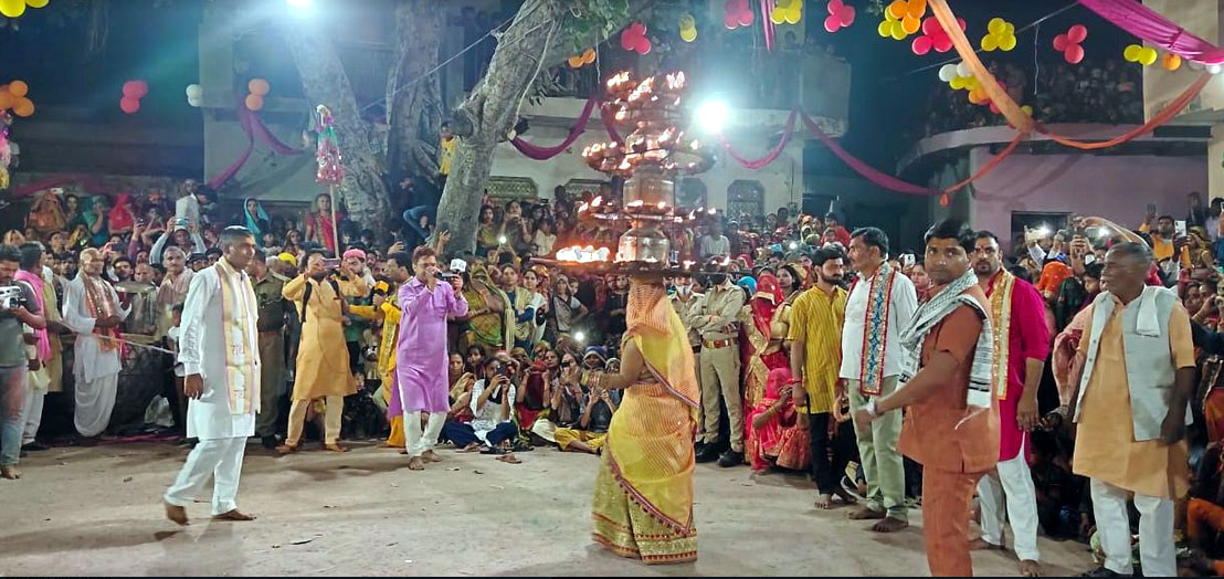 मथुरा (हि.स.)। वृषभान दुलारी श्रीराधारानी के ननिहाल गांव मुखराई में शनिवार रात्रि विश्व प्रसिद्ध चरकुला नृत्य का आयोजन हुआ जिसमें 108 दीपकों से जगमगाते पहिये को महिलाएं अपने सिर पर रखकर चरकुला नृत्य किया।