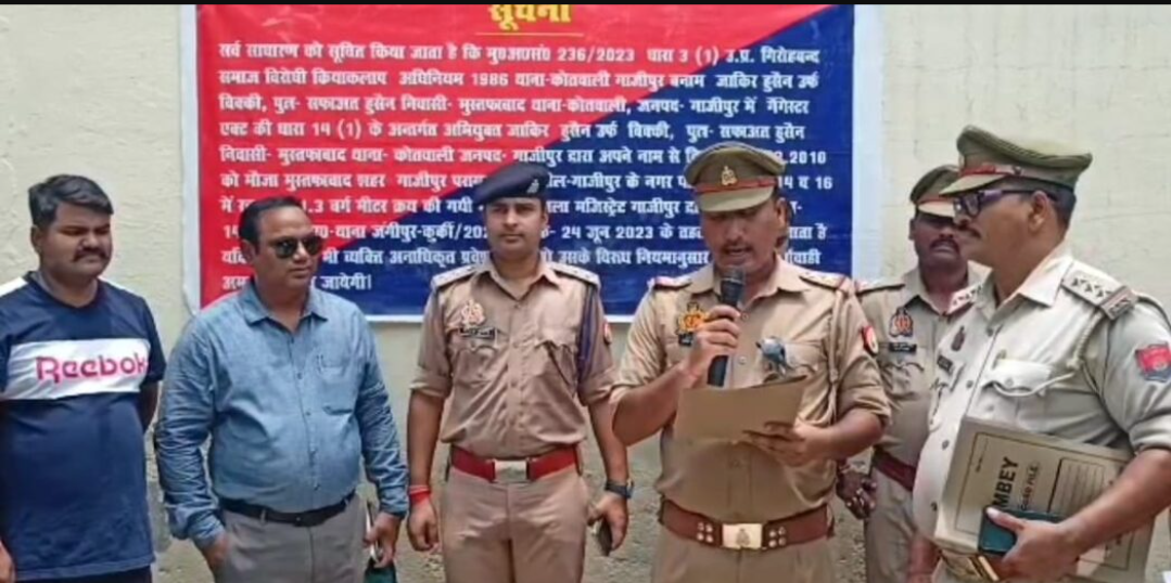 गाजीपुर(हि. स.)। माफिया मुख्तार अंसारी गिरोह 191 के सदस्य जाकीर हुसैन उर्फ विक्की की सदर कोतवाली क्षेत्र के मुस्तफाबाद में स्थित डेढ़ करोड़ की भूमि भवन को प्रशासन ने कुर्क कर दिया। तहसीलदार सदर और सीओ सिटी के नेतृत्व में भारी सुरक्षा बल के साथ मुनादी करा कर भूमि भवन को कुर्क किया गया।