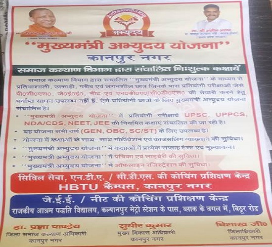 कानपुर विकास भवन के समाज कल्याण विभाग के मुख्यमंत्री अभ्युदय योजना की प्रभारी अधीक्षक किरन बाला और योजना के प्रचार प्रसार में लगे जितेन्द्र पाल ने मंगलवार को बताया यह योजना योगी सरकार आने के बाद पहली बार शुरू हुई। जिसके बाद से लगातार प्रतियोगी परीक्षा की तैयारी करने वाले ऐसे बच्चे जिनके पास कोचिंग के लिए पैसे नहीं है वह अपना पंजीकरण कराकर तैयारी कर रहे हैं।