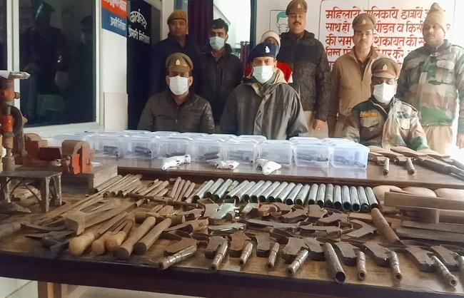 मुजफ्फरनगर (हि.स.)। उत्तर प्रदेश में विधानसभा चुनाव से पहले मुजफ्फरनगर पुलिस को लगातार दूसरे दिन बड़ी कामयाबी हाथ लगी है। पुलिस ने शनिवार को जिले में दो जगहों पर छापे मार कर हथियारों की दो अवैध फैक्टरियों का भंडाफोड़ करते हुए 68 निर्मित, 62 अर्धनिर्मित हथियार और हथियार बनाने के उपकरणों के साथ चार लोगों को गिरफ्तार किया, जबकि तीन लोग फरार हो गए। विधानसभा चुनाव में हिंसा फैलाने की मंशा से ये हथियार तैयार किए जा रहे थे।