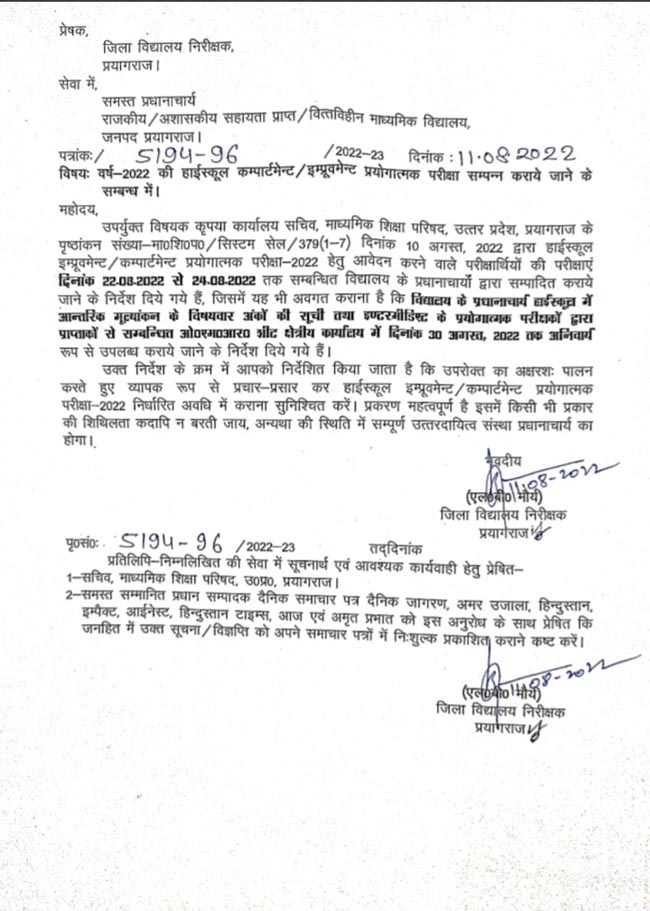 जिला विद्यालय निरीक्षक एल.बी मौर्य ने गुरुवार को बताया कि संबंधित विद्यालय के प्रधानाचार्य हाईस्कूल इम्प्रूवमेंट/कम्पार्टमेंट प्रयोगात्मक परीक्षा 2022 निर्धारित अवधि में कराना सुनिश्चित करें। इसके साथ ही हाईस्कूल में आंतरिक मूल्यांकन के अंकों की सूची व इण्टर प्रयोगात्मक परीक्षकों द्वारा प्राप्ताकों की ओएमआर शीट 30 अगस्त तक क्षेत्रीय कार्यालय में उपलब्ध कराने का निर्देश दिया है।