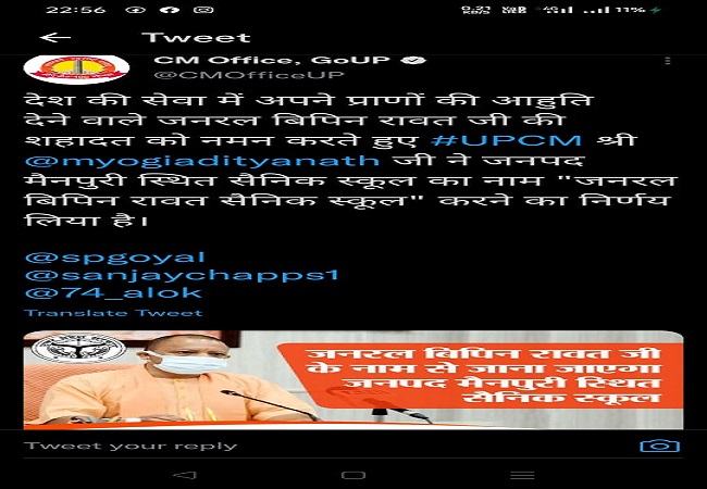 लखनऊ(हि.स.)। उत्तर प्रदेश की योगी आदित्यनाथ सरकार ने सीडीएस रहे स्वर्गीय जनरल बिपिन रावत के नाम पर मैनपुरी सैनिक स्कूल का नाम कर दिया है। मुख्यमंत्री कार्यालय की तरफ से ट्वीट कर इसकी जानकारी दी गयी है। मुख्यमंत्री कार्यालय ने बताया कि देश की सेवा में अपने प्राणों की आहुति देने वाले जनरल बिपिन रावत की शहादत को नमन करते हुए मुख्यमंत्री योगी आदित्यनाथ ने मैनपुरी जिले में स्थित सैनिक स्कूल का नाम ‘जनरल बिपिन रावत सैनिक स्कूल’ करने का निर्णय लिया है। अब यह स्कूल जनरल के नाम से जाना जाएगा।