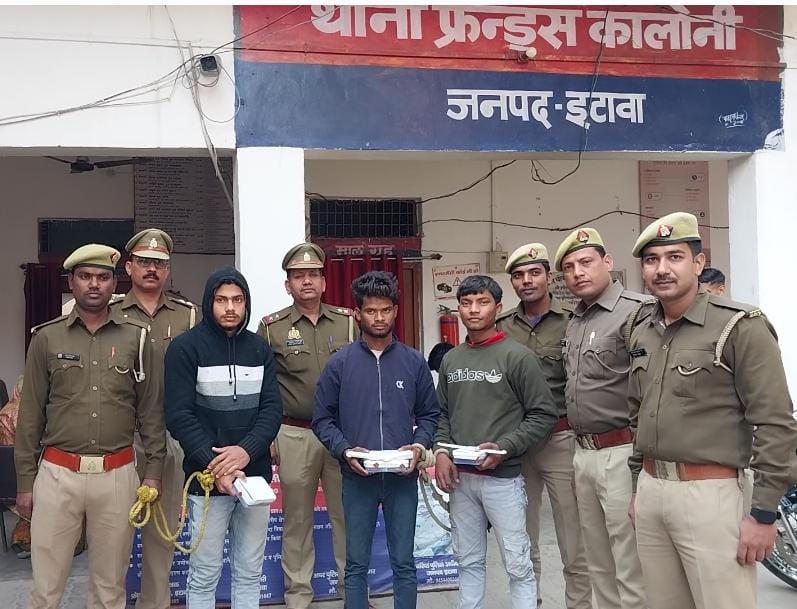 इटावा(हि.स.)। फ्रेंड्स कॉलोनी थाना पुलिस ने वाहन चेकिंग के दौरान राहगीरों से लूट करने वाले गिरोह के तीन शातिर आरोपियों को गिरफ्तार किया है। पुलिस ने गिरफ्तार लुटेरों के पास से राहगीर से लूटी हुई मोटरसाइकिल लूटे हुए आठ महंगे मोबाइल फोन एक अवैध तमंचा दो जिंदा कारतूस और एक धारदार चाकू बरामद किया है।