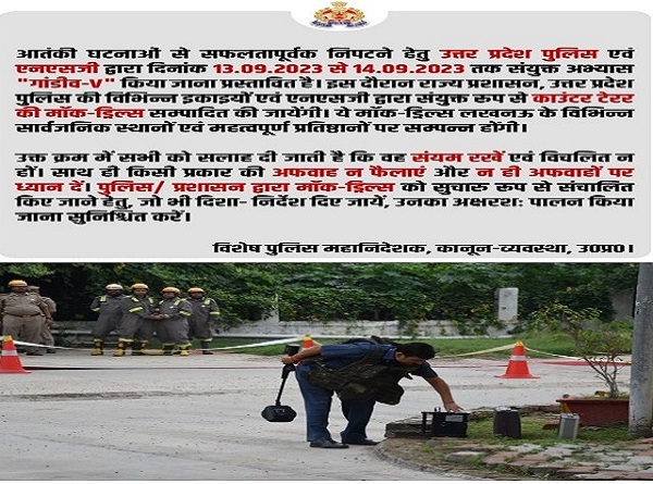 लखनऊ (हि.स.)। विशेष पुलिस महानिदेशक, कानून एवं व्यवस्था प्रशांत कुमार ने बताया कि आतंकी घटनाओं से सफलतापूर्व निपटने के लिए यूपी पुलिस एवं एनएसजी की टीम ने बुधवार और गुरुवार को संयुक्त अभ्यास ‘गांडीव-वी’ चला रही है।