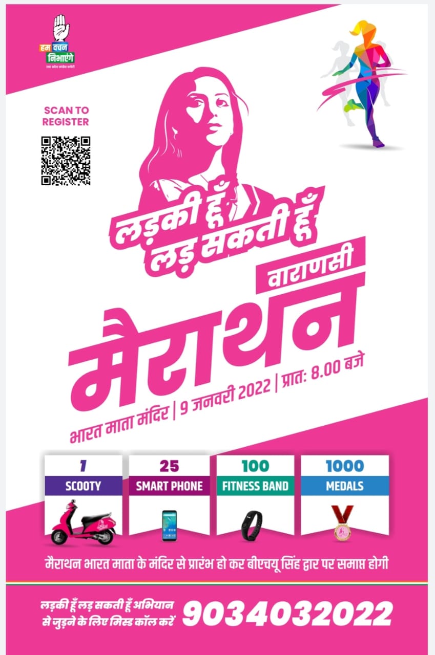 वाराणसी (हि.स.)। ‘लड़की हू लड़ सकती हू’ अभियान में कांग्रेस ने मैराथन दौड़ की तारीख बढ़ा दी है। अब मैराथन 06 जनवरी के बजाय नौ जनवरी को होगा। सिगरा स्थित भारत माता मंदिर परिसर से बीएचयू के सिंहद्वार तक आयोजित दौड़ को लेकर पार्टी की तैयारी चल रही है।