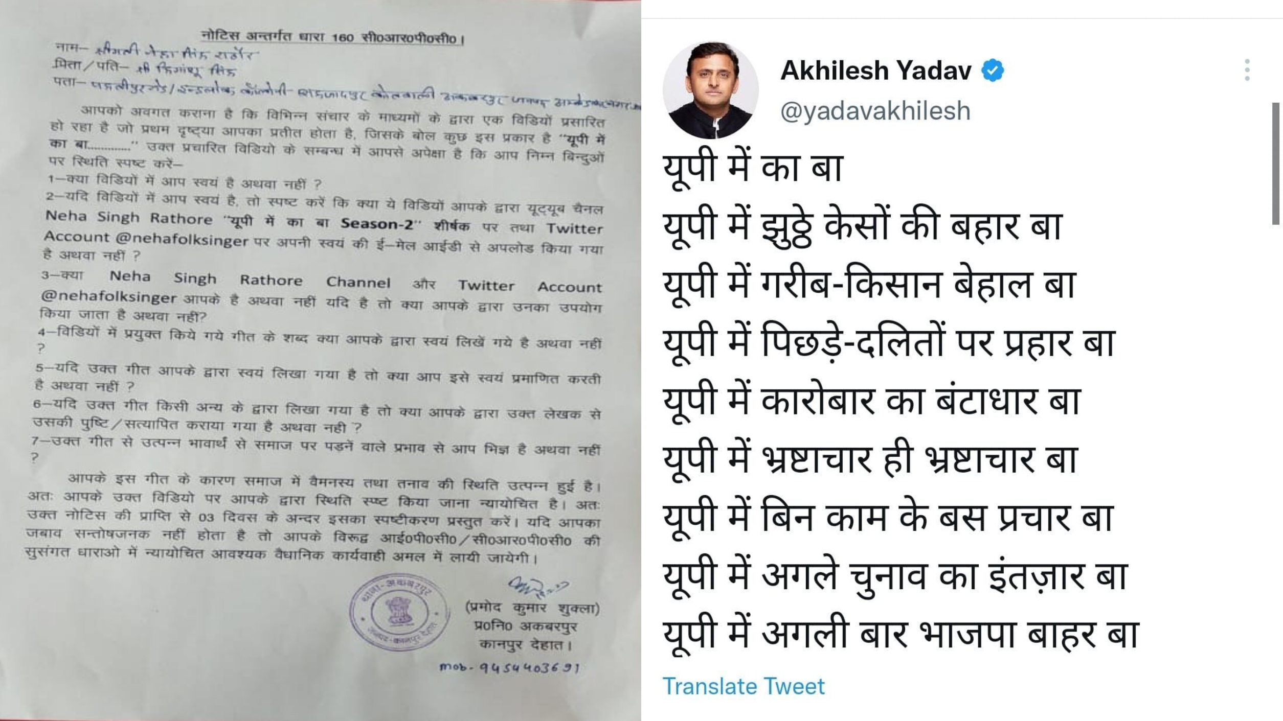 कानपुर देहात(हि.स.)। जनपद में हुए मड़ौली अग्निकांड की घटना को गाने से गाकर सरकार को घेरने वाली ‘यूपी में का बा’ की लोकप्रिय गायिका नेहा राठौर को पुलिस ने नोटिस दिया है। नेहा पर समाज में वैमनस्यता और तनाव की स्थिति उत्पन्न करने का आरोप लगाया गया है। इस पर सपा के राष्ट्रीय अध्यक्ष अखिलेश यादव ने सरकार पर सोशल मीडिया के माध्यम से पलटवार किया है।