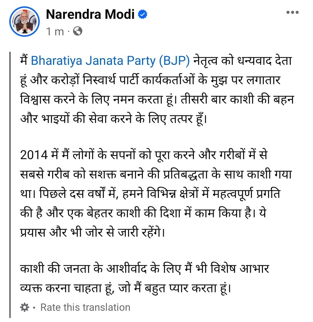 प्रधानमंत्री मोदी ने लिखा कि 2014 में मैं लोगों के सपने को पूरा करने और गरीबों में से सबसे गरीब को सशक्त बनाने की प्रतिबद्धता के साथ काशी गया था। पिछले 10 वर्षो में,हमने विभिन्न क्षेत्रों में महत्वपूर्ण प्रगति की है और बेहतर काशी की दिशा में काम किया है। ये प्रयास और भी जोर से जारी रहेंगे। काशी की जनता के आर्शिवाद के लिए मै भी विशेष आभार व्यक्त करना चाहता हूं,जो मै बहुत प्यार करता हूं।प्रधानमंत्री मोदी के तीसरी बार काशी से चुनाव लड़ने पर लोगों में जबरदस्त उत्साह है। शनिवार शाम से लेकर रविवार को भी भाजपा कार्यकर्ताओं के साथ आमलोगों ने खुशी जताई और प्रधानमंत्री मोदी के जीत की हैट्रिक के लिए संकल्प लिया।