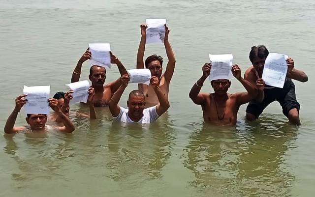 राष्ट्रीय विकलांग पार्टी के महासचिव वीरेंद्र कुमार ने बताया कि सीजनल संग्रह अमीन पिछले छह सालों से शासनादेश के अनुपालन को लेकर जिला प्रशाशन से विनियतीकरण की मांग कर रहे हैं। कई बार जिलाधिकारी व अपर जिला अधिकारी वित्त व राजस्व से बात हो चुकी है। चयन समिति का गठन हो चुका है, लेकिन बार-बार चयन समिति की बैठक को टाला जा रहा है। इससे सीजनल अमीन व अनुसेवकों का विनियमितीकरण नहीं हो पा रहा है। उनका कहना था कि हमारी उम्र ढलती जा रही है। परिवार व बच्चे भुखमरी के शिकार हो रहे हैं, लेकिन जिला प्रशाशन सरकार के आदेश का विनियतिमीकरण की कार्यवाही नहीं कर रहा है। इसलिए आज जल सत्याग्रह किया गया है।