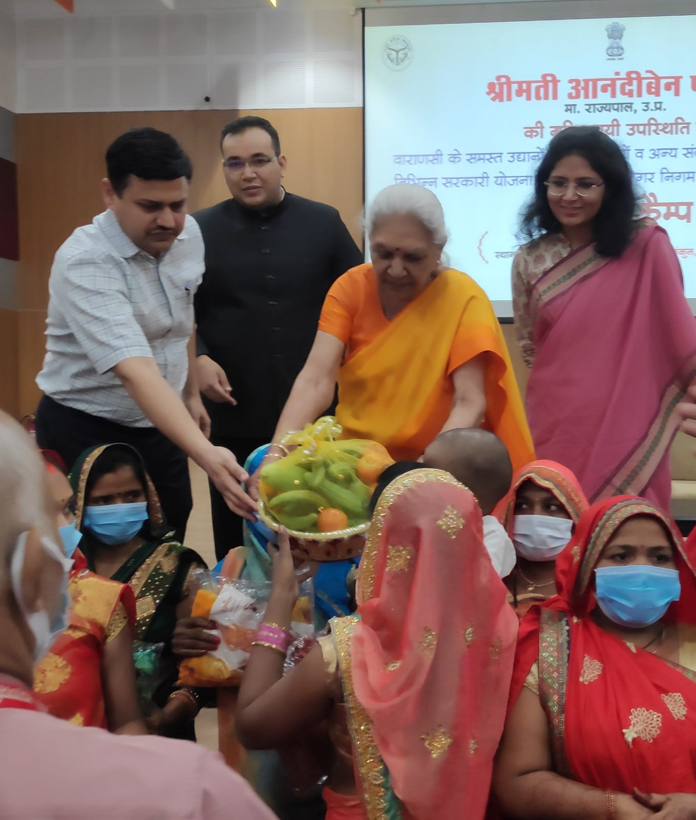 उन्होंने लोगो को संबोधित करते हुए कहा कि मौके पर लगे स्टालों पर जाकर आवश्यकतानुसार अपनी पात्रता के आधार पर फार्म भरें और योजनाओं का लाभ उठाएं। उन्होंने मौके पर मौजूद अधिकारियों को भी निर्देशित किया कि पात्र लाभार्थियों के आवेदन पत्र स्टालों पर आज अधिक संख्या में भरवाए जाएं और उन्हें प्राथमिकता पर स्वीकृति कर लाभान्वित किया जाए। उन्होंने महिलाओं से कहा की स्वास्थ्य विभाग द्वारा लगाए गए कैंप में जाकर वह अपना सर्वाइकल एवं कैसर आदि की निःशुल्क जांच कराएं। उन्होंने बताया कि विश्व में कैंसर के सभी मामलों में 25 फीसदी भारत में हैं। भारत में 100 कैंसर की पीड़ित महिलाओं में से 60 की मृत्यु हो जाती है। 30 वर्ष के पश्चात महिलाओं को सर्वाइकल एवं विशेष रूप से स्तन कैंसर की जांच नियमित रूप से कराया जाना चाहिए। उन्होंने विशेष रूप से जोर देते हुए महिलाओं से कहा कि महिलाएं पूरे परिवार की चिंता करती हैं और उनकी चिंता उन्हें है। इसीलिए यहां के अधिकारियों ने महिलाओं के लिए विशेष चिकित्सा कैम्प का आयोजन किया है। कैम्प में जांच निःशुल्क है और यदि जांच उपरांत दवा की आवश्यकता पड़ेगी, तो वह भी पूरी तरह निःशुल्क है। इस अवसर पर राज्यपाल आनंदीबेन पटेल ने प्रतीकात्मक रूप से उद्यान विभाग के संतोष कुमार साहनी, मुकेश कुमार, महावीर पाण्डेय, प्रकाश सोनकर, जगदीश प्रसाद, देवी दयाल प्रजापति, जयप्रकाश गुप्ता, अजीत कुमार सिंह, को ई-श्रम कार्ड, रामबचन, राजकुमार, मोहनलाल, ईश्वर चंद यादव, राहुल प्रजापति, प्रदीप कुमार को प्रधानमंत्री सुरक्षा योजना का प्रमाण पत्र तथा सरिता प्रजापति को प्रधानमंत्री स्व निधि योजना का प्रमाण पत्र उपलब्ध कराएं। तत्पश्चात उन्होंने राजभवन से लायी गई साड़ियों को नगर निगम की सफाई कर्मियों क्रमशः अजोरा देवी, शशि कला देवी, मन भावती देवी, रंजू भारती, कमला देवी, नीलम देवी, सविता देवी, माया देवी, नीतू सिंह, सोनी पांडेय, निन्नी, नीलू देवी, कृष्णा देवी और रुखसाना को अपने हाथों से दिया।