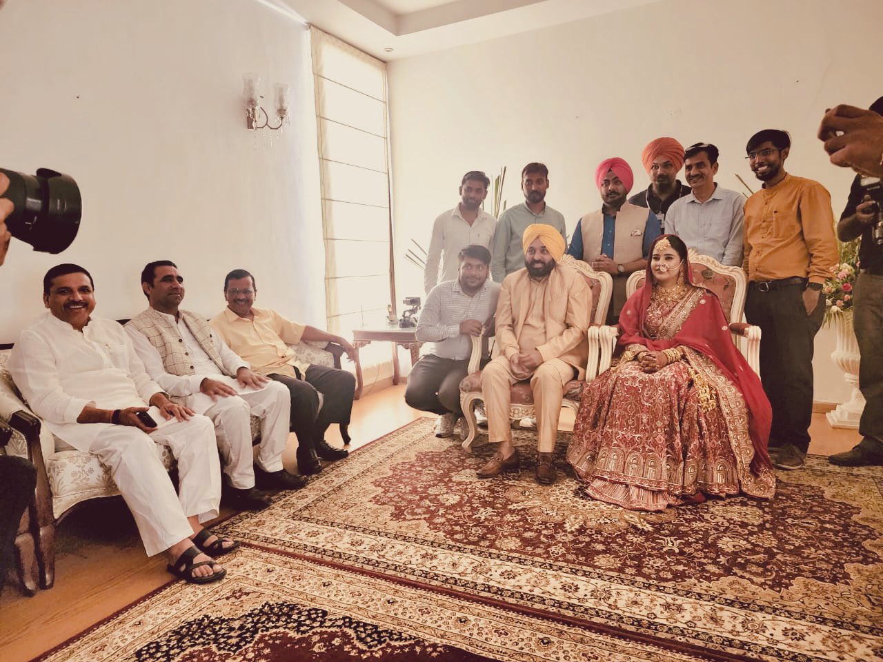 आज मान की शादी समारोह में दिल्ली के सीएम केजरीवाल परिवार के साथ मौजूद रहे। आप के वरिष्ठ नेता संजय सिंह और राघव चड्ढा भी विवाह समारोह में मौजूद रहे।