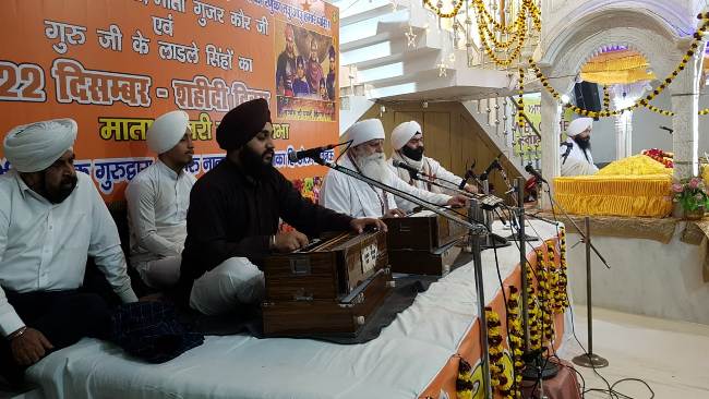 नाका हिन्डोला स्थित ऐतिहासिक गुरूद्वारा श्री नानक देव जी में हजूरी रागी जत्था भाई राजिन्दर सिंह ने पवित्र आसा दी वार का शबद कीर्तन समूह संगत को निहाल किया। सहज पाठ की समाप्ति के उपरान्त मुख्य ग्रन्थी ज्ञानी संच्चा सिंह जी पटियाला वालों ने कथा व्याख्यान करते हुए बताया कि सन् 1704 में चमकौर की गढ़ी में श्री गुरू गोबिन्द सिंह जी के बडे़ साहिबजादे बाबा अजीत सिंह एवं बाबा जुझार सिंह ने 10 लाख मुगल फौज का सामना करते हुए शहादत प्राप्त की। छोटे साहिबजादों बाबा जोरावर सिंह एवं बाबा फतहि सिंह ने जब इस्लाम कबूल नहीं किया तो उन्हें सरहंद के नवाब ने जिन्दा ही नीव में चुनवा दिया। पोतों की शहादत के बाद माता गुजर कौर जी ने भी अपने प्राण त्याग दिये।
