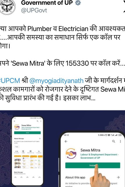 लखनऊ(हि.स.)। उत्तर प्रदेश के श्रम व रोजगार विभाग की ओर से सेवा मित्र नामक जनकल्याणकारी योजना शुरु की गयी है। जिसमें प्रदेशवासियों को घर बैठे बिजली मिस्त्री, बढ़ई, राजमिस्त्री, प्लम्बर जैसे हुनरमंद व्यक्ति की जानकारी मिलेगी। मोबाइल में ऐप डाउनलोड करने के बाद विद्युत समस्या होने पर बिजली मिस्त्री घर तक बुलाये जा सकेंगे। वहीं नल से पानी ना आने, टंकी की लिकेज होते ही प्लम्बर आपके द्वार पर आ खड़े होंगे।