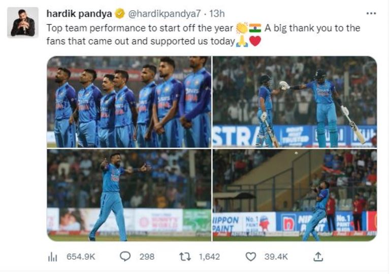 पांड्या ने ट्वीट किया, “साल की शुरुआत में टीम का शानदार प्रदर्शन, प्रशंसकों का बहुत-बहुत धन्यवाद, जो स्टेडियम आए और हमारा समर्थन किया।”