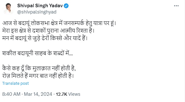 शिवपाल यादव ने अपने सोशल मीडिया अकाउंट एक्स से बदायूं दौरे की जानकारी दी है। उन्होंने पोस्ट में लिखा कि आज से बदायूं लोकसभा क्षेत्र में जनसम्पर्क हेतु यात्रा पर हूं। मेरा इस क्षेत्र से दशकों पुराना आत्मीय रिश्ता है। मन में बदायूं से जुड़े ढेरों किस्से और यादें हैं।