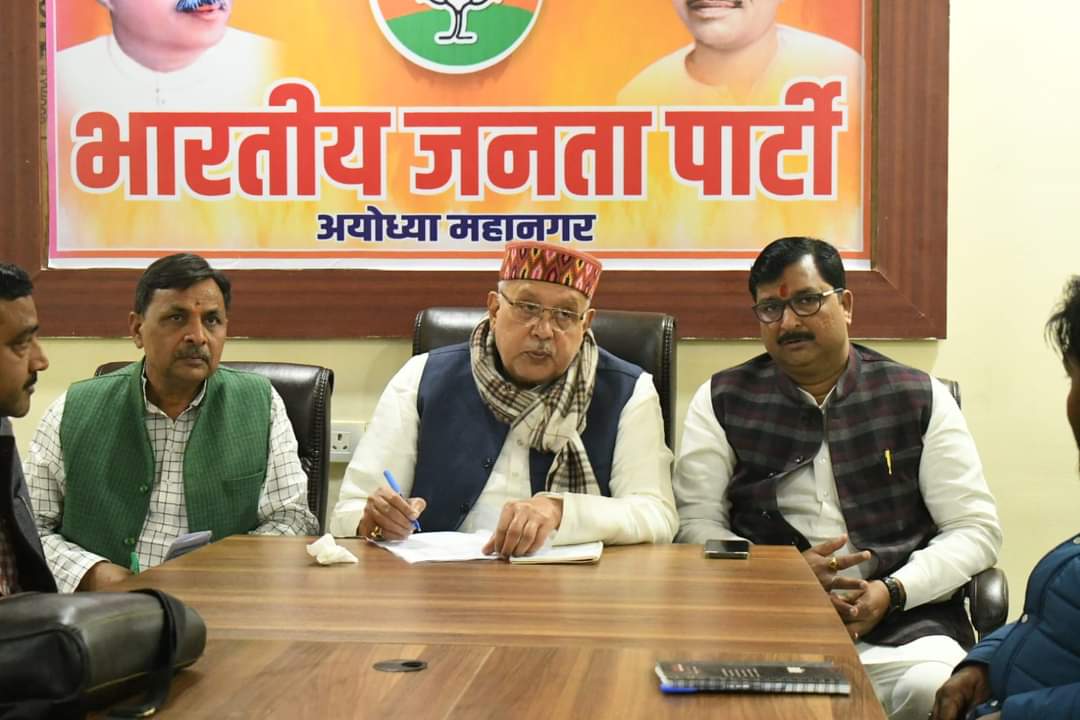 अयोध्या (हि. स.)। कृषि मंत्री सूर्य प्रताप शाही ने शनिवार को सहादतगंज स्थित भाजपा कार्यालय में पार्टी की नगर निगम चुनाव संचालन समिति के साथ बैठक किया। बैठक के दौरान उन्होंने महानगर की संगठनात्मक स्थिति, चुनाव को लेकर बनायी गयी रणनीति व तैयारियों के बारे में जानकारी हासिल की। इससे पहले पार्टी कार्यालय पहुंचने पर पदाधिकारियों व कार्यकर्ताओं ने कृषि मंत्री का स्वागत किया। कृषि मंत्री सूर्य प्रताप शाही नगर निगम चुनाव के प्रभारी भी हैं।