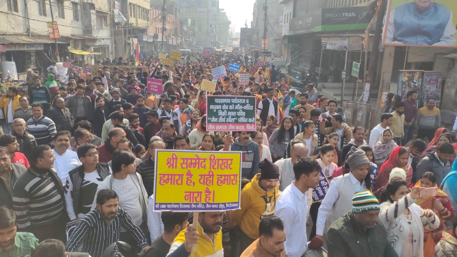देश में चल रहे सबसे बड़े जैन तीर्थ सम्मेद शिखर बचाओ आंदोलन के तहत रविवार को जैन समाज ने अट्टा वाला दिगम्बर जैन मंदिर से जुलूस निकाला। इस जुलूस में जैन समाज के महिला, पुरुष, बुजुर्ग, और बच्चों ने बड़ी संख्या में भाग लिया। हजारों की संख्या में जैन श्रद्धालु पैदल मार्च करते हुए हाथों में तख्ती लेकर सदर बाजार, सेंट्रल चौराहा, बाघ छिंगा मल, कंपनी बाघ चौराहा और बस स्टैंड होते हुए श्री महावीर जिनालय सुभाष चौराहे पर एकत्र हुए। जैन समाज के युवा उद्यमी अनुज जैन ने कहा कि सम्मेद शिखर दिगम्बर, श्वेताम्बर का ही नहीं बल्कि पूरे जैन धर्म के सभी अनुयाइयों का पवित्र तीर्थ स्थल है। इसे गलत हाथों में नहीं जाने देंगे। सम्मेद शिखर को पर्यटन स्थल बनाए जाने का आदेश सरकार वापस ले।