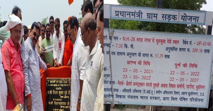 कुशीनगर(हि. स.)। कुशीनगर विधानसभा क्षेत्र के चार स्थानों पर 1548.76 लाख की लागत से निर्मित 24 किमी लम्बी सड़क का लोकार्पण कुशीनगर के सांसद विजय दुबे व विधायक पी एन पाठक ने संयुक्त रूप से किया। प्रधानमंत्री सड़क रोजगार योजना के तहत एन एच 28 के प्रेमवलिया से मैनपुर कोट देवी स्थान तक 6 किलोमीटर लम्बी सड़क लागत 360. 70 लाख रुपये,बरवां जंगल से कुलकुला देवी साढ़े सात किलोमीटर मार्ग लागत 509.16लाख रुपये, कसया से धुरियाँ 6 किलोमीटर मार्ग लागत 351.41 लाख रुपये और रामनगर से महुअवां बाजार 6 किलोमीटर मार्ग 327.49 लागत से सड़कों का निर्माण किया गया है।