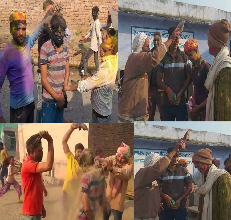 धुलंडी के दिन गांव में जूता-चप्पल मार होली खेली गई। फाल्गुन माह आते ही ब्रज में होली महोत्सव, होलिका दहन, हुरंगा जैसे कार्यक्रम आयोजित होने लगते हैं। ब्रज में आपने रंगों की होली, लठ्ठमार होली, कपड़ा फाड़ होली, कीचड़ होली मनाते तो सुना होगा। लेकिन, एक जगह ऐसी भी है जहां एक-दूसरे को गुलाल लगाने के साथ जूता-चप्पल मारकर होली खेली जाती है। सुनकर आपको थोड़ा अजीब लगेगा, लेकिन ब्रज की इस अनोखी होली का अपना अगल ही अंदाज है। खुटैलपट्टी के बछगांव गांव के लोग अपने से कम उम्र के लोगों को गुलाल लगाने के साथ सिर पर जूता-चप्पल मारकर होली की शुभकामनाएं और आशीर्वाद देते हैं। यह परंपरा सदियों से चली आ रही है। बुधवार दोपहर से देरशाम तक लोगों ने यहां इसी प्रकार से होली खेली।