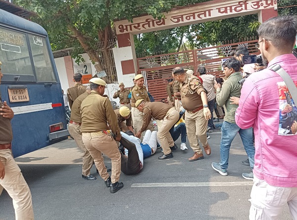लखनऊ(हि.स.)। 69 हजार शिक्षक भर्ती के अभ्यर्थी अपनी मांग को लेकर सोमवार को हजरतगंज स्थित भारतीय जनता पार्टी के प्रदेश कार्यालय में पहुंचकर प्रदर्शन करने लगे। इस दौरान भारी संख्या में पुलिस बल पहुंच गई और सभी अभ्यर्थियों को पुलिस वैन में भरकर प्रदर्शनकारियों को रमाबाई मैदान भेजने लगे।