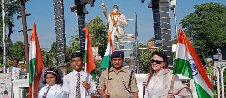 गोंडा। आजादी के अमृत महोत्सव के अन्तर्गत जिले में चहुंओर कार्यक्रमों की धूम मची हुई है। कहीं तिरंगा रैली निकाली जा रही है, तो कहीं साइकिल, मोटर साइकिल और ट्रैक्टर रैली निकालकर तिरंगे और राष्ट्र के प्रति लोग अपनी श्रद्धा को प्रदर्शित कर रहे हैं। जिला मुख्यालय पर इंद्रा इंटरनेशनल स्कूल की तरफ से शनिवार की सुबह तिरंगा यात्रा निकाली गई। संविधान निर्माता भारत रत्न बाबा साहब भीमराव आम्बेडकर की प्रतिमा पर मार्ल्यापण करने के बाद अपर पुलिस अधीक्षक शिवराज ने तिरंगा रैली को हरी झंडी दिखाकर रवाना किया। रैली शहीदे आजम भगत सिंह इंटर कालेज में पहुंचकर उनकी प्रतिमा के समक्ष पुर्ष्पापण के साथ समाप्त हो गई। पूरी यात्रा के दौरान एएसपी स्वयं तिरंगा लेकर साथ में चल रहे थे। इस मौके पर कालेज की प्रधानाचार्य एच. मोलाय, वरिष्ठ पत्रकार जानकी शरण द्विवेदी, यातायात निरीक्षक अभिनव प्रताप सिंह समेत कालेज के शिक्षक इमैनुअल, सईद खान, सोनाली उपाध्याय, मो. इमरान, ग्रेस पेमाई, मैरी पेमाई, नेहा मिश्रा, रंजना शुक्ला, अंशिका शुक्ला, प्रभाकरन, समीर, अजय कुमार समेत करीब डेढ़ सौ छात्र-छात्राएं उपस्थित रहे।