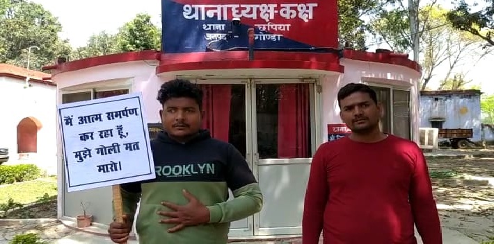 गोण्डा। ‘मैं आत्म समर्पण कर रहा हूं। कृपया मुझे गोली मत मारो।‘ मंगलवार को दोपहर बाद अपने हाथ में यह स्लोगन लिखी तख्ती लेकर मुर्गी दाना व्यापारी के अपहरण काण्ड में वांछित 25 हजार रुपए के इनामी चौथे अभियुक्त गौतम सिंह ने छपिया थाने में आत्म समर्पण कर दिया।