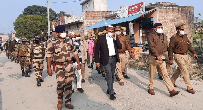 गोण्डा। जिले में स्वतंत्र, निष्पक्ष एवं शांतिपूर्ण निर्वाचन सम्पन्न कराने के लिए जिला प्रशासन की तरफ से कसरत तेज कर दी गई है। जन सामान्य में सुरक्षा का भाव तथा अराजक व आपराधिक तत्वों में दहशत पैदा करने के उद्देश्य से अर्द्ध सैनिक बलों के साथ वरिष्ठ अधिकारियों द्वारा क्षेत्र भ्रमण शुरू कर दिया गया है। गोण्डा सदर विधानसभा क्षेत्र के रिटर्निंग आफीसर/एसडीएस सदर विनोद कुमार सिंह तथा क्षेत्राधिकारी सदर लक्ष्मीकांत गौतम की अगुवाई में शुक्रवार को कोतवाली देहात थाना क्षेत्र के अन्तर्गत संवेदनशील व मिश्रित आबादी वाले क्षेत्रां में भारी संख्या में पुलिस बल व अर्द्ध सैनिक बल के जवानों के साथ मोटर साइकिल दस्ते व पैदल टुकड़़ी ने क्षेत्र भ्रमण किया। अधिकारियों ने आम लोगों से संवाद स्थापित कर कोविड-19 गाइड लाइन का पूर्णतया पालन करने तथा शांतिपूर्ण एवं निर्भीक होकर मतदान करने का अनुरोध किया। अधिकारियों ने कहा कि कानून के साथ खिलवाड़ करने वालों के खिलाफ कठोर कार्रवाई की जाएगी। एसडीएम ने प्रभारी निरीक्षक को प्रत्येक ग्राम पंचायत से अराजक तत्वों को चिन्हित कर उन्हें भारी मुचलके से पाबंद कराने के लिए उनके खिलाफ रिपोर्ट भेजने का निर्देश दिया। पैदल गश्त के दौरान थाना क्षेत्र के अंतर्गत लगे बैनर व पोस्टर हटवाए गए। साथ ही वाहनों की चेकिंग भी की गई।