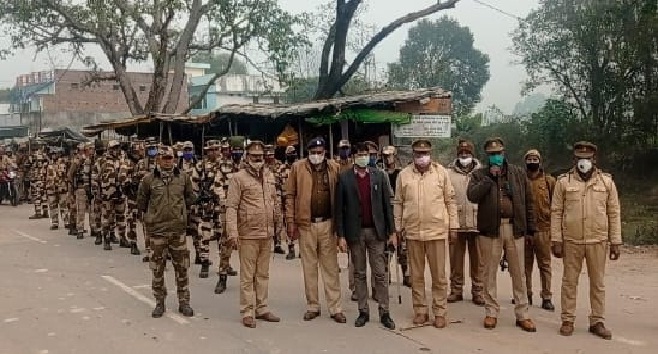 उमरी बेगमगंज, गोण्डा। आगामी विधानसभा चुनाव के मद्देनजर एसडीएम तरबगंज कुलदीप सिंह, क्षेत्राधिकारी संसार चन्द राठी व थानाध्यक्ष उमरी बेगमगंज के नेतृत्व में पैरामिलिट्री फोर्स के साथ स्थानीय पुलिस फोर्स ने उमरी बेगमगंज के मुख्य मार्ग पर फ्लैग मार्च कर आम नागरिकों की सुरक्षा का एहसास दिलाया। क्षेत्राधिकारी तरबगंज ने चुनाव में शांतिपूर्ण ढंग से मतदान करने एवं निर्भीक होकर निष्पक्ष चुनाव करने की भी अपील की। थानाध्यक्ष ने बताया कि चुनाव में किसी प्रकार की हिमाकत करने वालों पर गैंगस्टर की कार्यवाही की जाएगी। अफवाह फैलाने वाले तत्वों पर पुलिस की नजर रहेगी। आदर्श आचार संहिता का पालन करने और पुलिस का सहयोग करने को कहा। चुनाव में किसी भी प्रकार के प्रलोभन में ना आए तथा समझ-बूझकर निष्पक्ष मतदान करें। उन्होंने बताया कि अराजक तत्वों की सूचना सीधा पुलिस को दें। चुनाव में भाईचारे के साथ रहने का आहवान किया तथा चुनाव में माहौल खराब करने वालों पर सख्त कार्यवाही करने की चेतावनी भी दी। फ्लैग मार्च में पैरामिलिट्री फोर्स के साथ स्थानीय पुलिस बल के जवान रहे।