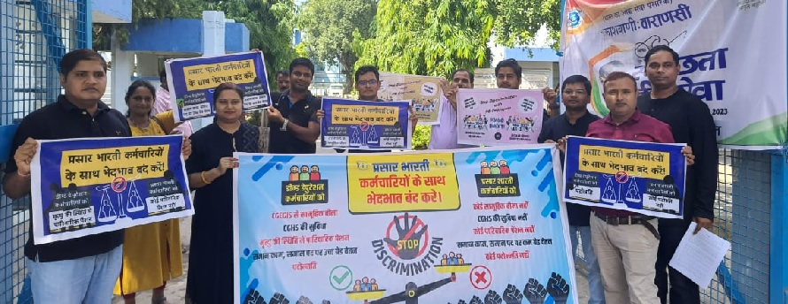 वाराणसी। “प्रसार भारती” के कर्मचारियों ने विभागीय “कट-ऑफ-डेट” 05 अक्टूबर 2007 के आधार पर विभाग द्वारा कर्मचारियों से किये जा रहे “भेदभाव” को दूर करने के लिए देशव्यापी शांतिपूर्ण प्रदर्शनों के क्रम में आकाशवाणी वाराणसी के मेन गेट पर प्रदर्शन किया, जिसमें आकाशवाणी वाराणसी के कार्यक्रम, इंजीनियरिंग और लेखा अनुभागों के सभी प्रसार भारती कर्मचारी शामिल हुये। यह देश व्यापी शांतिपूर्ण प्रदर्शन आकाशवाणी वाराणसी के अलावा गोरखपुर, प्रयागराज, दिल्ली, मुंबई, कोलकाता, चेन्नई, लखनऊ, बेंगलुरू, जयपुर, गुवाहाटी, हैदराबाद, अहमदाबाद, पटना, रांची व शिमला सहित देश के कई अन्य बड़े और छोटे शहरों में आकाशवाणी और दूरदर्शन के मुख्य द्वार पर किया गया। इस प्रदर्शन का आह्वान प्रसार भारती के कार्यक्रम, इंजीनियरिंग व प्रशासनिक कर्मचारियों के विभिन्न संगठनों द्वारा बनाए गए “संयुक्त मंच” जॉइन्ट एक्शन फोरम फॉर प्रसार भारती एम्प्लॉईस ने किया था। यह जानकारी देते हुए आकाशवाणी वाराणसी के कार्यक्रम अधिशासी प्रफुल्ल कुमार सिन्हा ने बताया कि “संयुक्त मंच” ने 05 अक्टूबर की तारीख को “काला दिवस” के रूप में भी मनाने की घोषणा की, क्योंकि इसी तारीख के बाद चयनित हुए कर्मचारियों के साथ प्रसार भारती भेदभावपूर्ण रवैया अपना रही है। इस प्रदर्शन में आकाशवाणी वाराणसी के एक दर्जन से ज्यादा प्रसार भारती के कर्मचारी व अधिकारी शामिल हुए। प्रदर्शन कर रहे कर्मचारियों की कई मांगें रहीं, जिसमें समान काम के लिए समान वेतन, प्रमोशन और बेहतर स्वास्थ्य सुविधा के लिए भारत सरकार की केंद्रीय कर्मियों को मिलने वाली केंद्रीय सरकारी स्वास्थ्य योजना (सीजीएचएस) का लाभ प्रमुख है। इससे पहले भी अपनी मांगों को लेकर प्रसार भारती के कर्मचारियों ने प्रसार भारती सचिवालय, नयी दिल्ली के समक्ष 19 सितंबर को शांतिपूर्ण प्रदर्शन किया था। अपनी माँगों को पूरा होते न देख प्रसार भारती कर्मचारियों ने आज दोबारा देशव्यापी शांतिपूर्ण प्रदर्शन किया। प्रदर्शन में शामिल आकाशवाणी वाराणसी के कार्यक्रम अधिशासी अशोक कुमार पाण्डेय ने बताया कि प्रसार भारती के कर्मचारियों के इलाज की कोई ठोस व्यवस्था नहीं है। प्रसार भारती से हमारी मांग है कि कर्मचारियों के लिए सीजीएचएस का लाभ, ग्रुप इन्श्योरेन्स, फॅमिली पेंशन, समान पद-समान वेतन व समय से पदोन्नति सहित अन्य लाभ हमें भी दिया जाए। अभियांत्रिकी सहायक कमल साहनी ने यह भी आरोप लगाया कि प्रसार भारती ने वर्ष 2019 में केंद्र सरकार द्वारा घोषित नए पेंशन स्कीम में एमप्लॉयर द्वारा दिए जाने वाले 14 प्रतिशत अंशदान को अभी तक देना नहीं शुरू किया है। उन्होनें माँग रखी कि प्रसार भारती को हर महीने 14 प्रतिशत पेंशन राशि का अंशदान क
